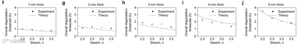通过上述的实验平台,团队测试了不同厚度和不同拉伸条件下材料降解的速度。团队观察到,拉伸可显著缩短降解时间。例如,厚度为5 mm的样品,在低拉伸比(λ = 2.0)降解需要3.5小时,而在高拉伸比(λ = 3.5)条件下降解会缩短到1.9 小时。不同厚度下,越厚的样品降解越慢,而拉伸对厚样品的加速效果会更明显。