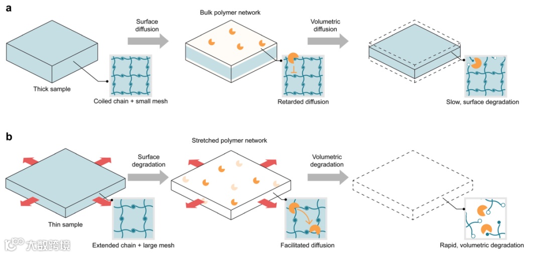 图四:不同拉伸条件下的降解过程:(a)无拉伸时发生缓慢的表面降解,(b)有拉伸时发生快速的体积降解。