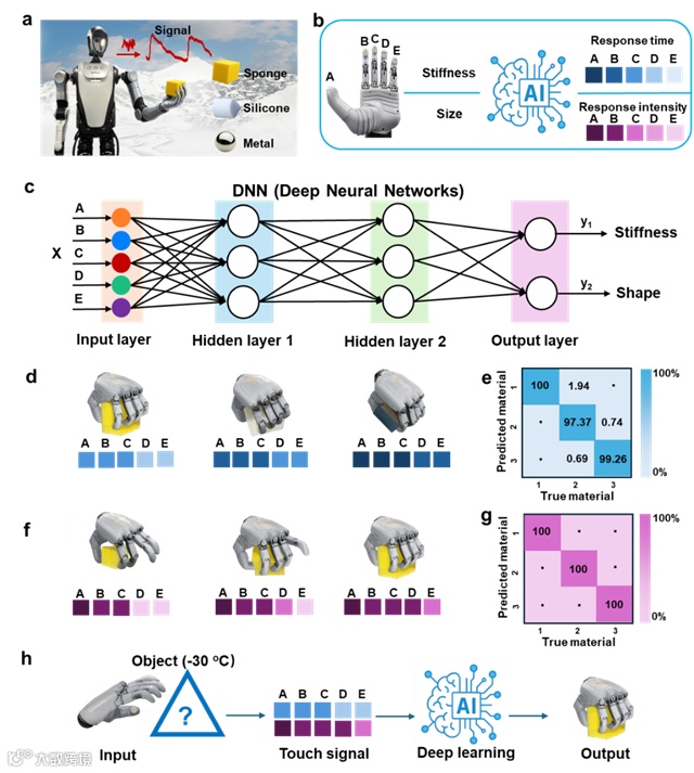 图6展示实际应用:集成水凝胶传感器的机械手在-30℃抓取物体(图6a-b),通过响应时间识别刚度(海绵/硅胶/金属准确率>97%,图6d-e),通过激活传感器数量判别尺寸(100%准确,图6f-g)。结合深度学习(图6c),系统成功实时识别8cm³海绵立方体(图6h)。