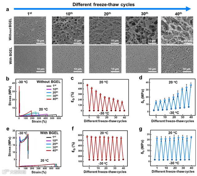 图4揭示BGEL的长期保护作用:普通PAMAC经40次冻融后结构碎裂(图4a),断裂强度波动超50%(图4b-d);而含BGEL样品形态完好(图4a),力学性能几乎无衰减(图4e-g)。