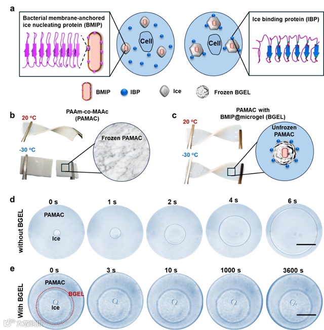 图1揭示该水凝胶的协同抗冻机制:BMIP在微球(BGEL)内促进冰早期成核,而IBP吸附于冰晶表面抑制生长。对比实验显示,普通聚(丙烯酰胺-共-甲基丙烯酸)(PAMAC)凝胶在-30℃脆化(图1b),冰晶6秒内蔓延整个网络(图1d);而含BGEL的样品低温下保持柔性(图1c),冰晶3600秒内被限制在微球内(图1e),实现"冰晶局部化"。