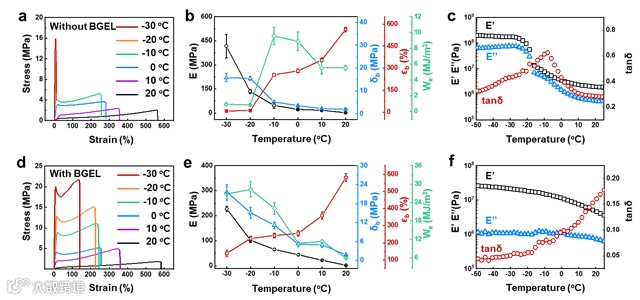 图3对比了低温力学行为:普通PAMAC在-30℃断裂应变骤降至7%(图3a-b),动态热机械分析(DMA)显示其储能模量飙升至1GPa(近冰的刚性,图3c);而含BGEL样品在-30℃仍保持138%延展性(图3d-e),储能模量仅26MPa(图3f),证明基质未冻结。优化实验表明10wt% BGEL含量使拉伸强度达21.7MPa。