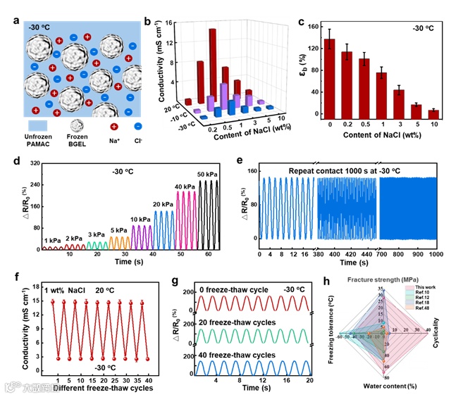 图5证实该水凝胶的导电稳定性:1wt% NaCl添加使电导率在-30℃达2.6 mS·cm⁻¹(图5b),归功于离子在未冻结基质中的迁移(图5a)。基于此的传感器在-30℃压力响应稳定(图5d-e),40次冻融后性能不变(图5f-g)。雷达图显示其综合性能(强度、冻融稳定性、含水率)超越传统抗冻凝胶(图5h)。