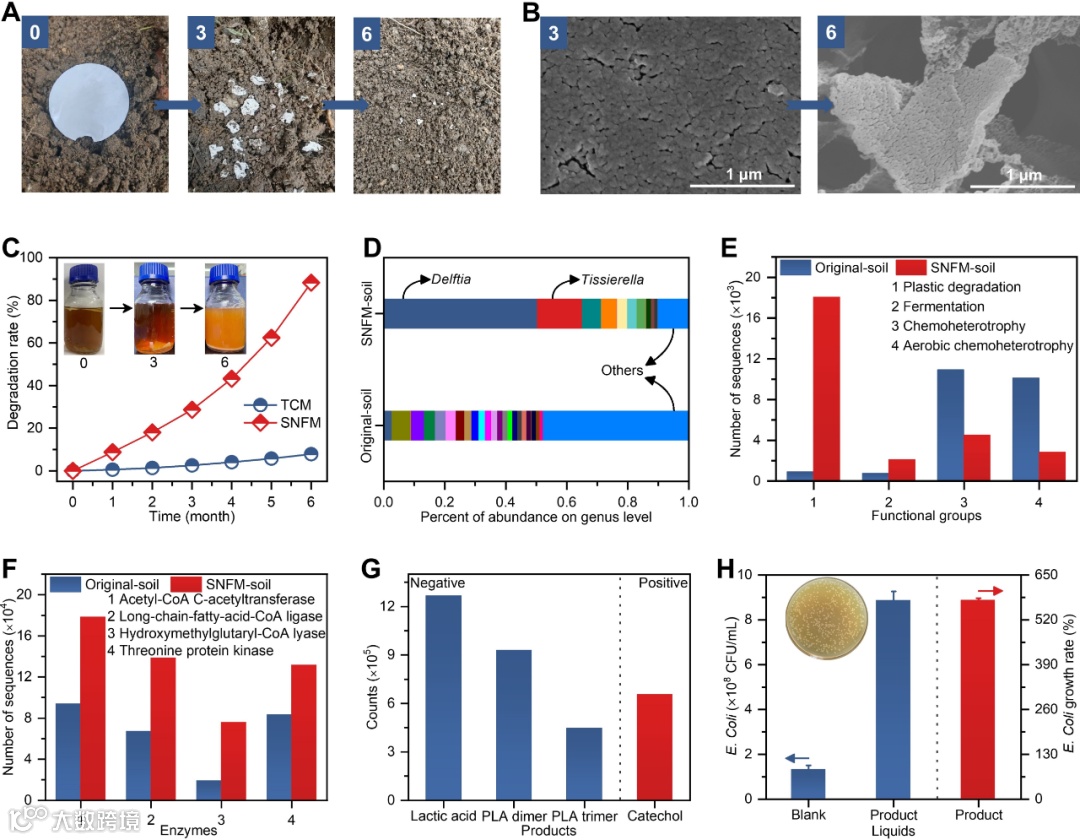 图2:SNFM的降解机理和产物。(A)土壤自然降解0、3、6个月后的SNFM图像。(B)在3个月(左)和6个月(右)时被土壤微生物降解的SNFM表面的SEM图像(放大倍数:50k×)。(C)基于土壤微生物的SNFM降解速率。插图:土壤微生物在0、3和6个月时降解SNFM的快照。(D)原始土壤和SNFM土壤中群落丰度百分比。(E)原土和SNFM土壤中不同功能物种群落丰度。(F)原土和SNFM土壤中酶的丰度。(G)SNFM的降解产物。(H)SNFM降解产物对大肠杆菌生长的影响。插图:大肠杆菌在含有SNFM降解产物的溶液中的生长图像。