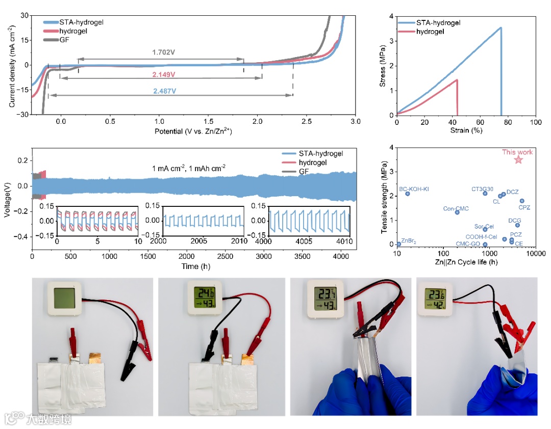 图三:STA水凝胶电解质的电化学窗口、力学拉伸曲线、对称电池循环、以及在软包电池充放电过程中机械柔性与电化学稳定性展示。