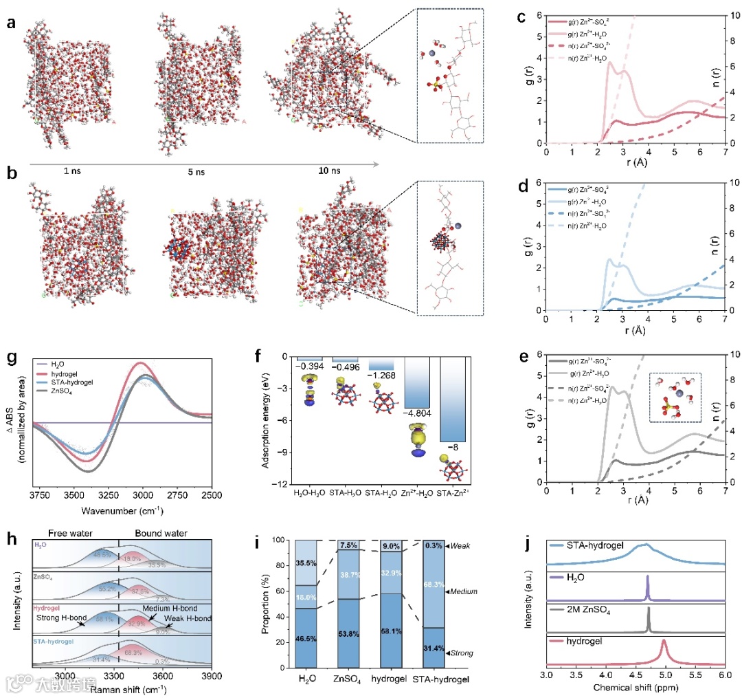 图二:STA水凝胶中电解质离子水合结构表征与分子动力学模拟计算。