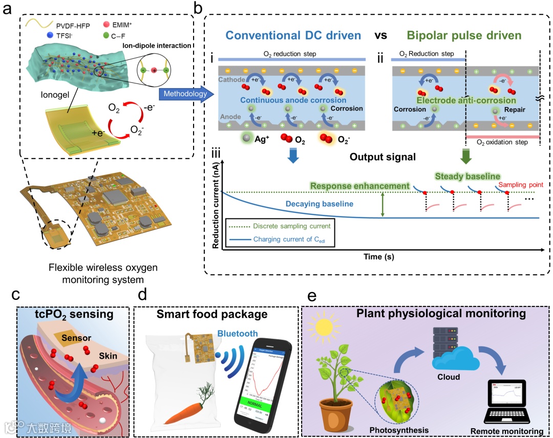 为突破现有性能限制,本研究创新性地开发了一种基于环境稳定型离子凝胶电解质和双极性脉冲驱动方法的高性能柔性室温氧传感器(图1a)。该离子凝胶材料可确保传感器在严苛环境下稳定工作。通过利用电化学反应的可逆特性,双极性脉冲驱动法周期性施加反向电位以修复阳极表面,有效抑制电极腐蚀(图1bi-ii)。其固定短采样时间设计不仅将基线稳定速度提升50倍,同时显著增强了响应电流和灵敏度(图1biii)。将可穿戴传感器安装在加热的手腕上以监测经皮氧分压,从而实现无创生理状态评估(图 1c)。此外,通过将传感器与定制的无线监测电路集成,开发了一种柔性无线氧监测系统,并将其应用于评估食品包装的密封完整性,从而实现食品在储存和运输过程中新鲜度和风味的实时监测(图 1d)。此外,该集成系统还被贴合在植物叶片的下侧以实时监测局部氧含量,收集的数据上传至云端,从而实现对植物生长状况的远程监测(图 1e)。这种具有增强稳定性和灵敏度的实时氧传感器成功地展示了其在各种高性能场景中的长期适用性,为可穿戴医疗监测设备、先进食品储存技术和智能农业系统的开发提供了创新视角。
