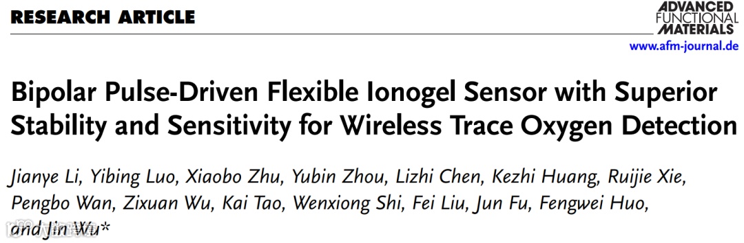 Li, J.; Luo, Y.; Zhu, X.; Zhou, Y.; Chen, L.; Huang, K.; Xie, R.; Wan, P.; Wu, Z.; Tao, K.; Shi, W.; Liu, F.; Fu, J.; Huo, F.; Wu, J.* Bipolar Pulse-driven Flexible Ionogel Sensor with Superior Stability and Sensitivity for Wireless Trace Oxygen Detection. Advanced Functional Materials 2025, e14304,DOI: 10.1002/adfm.202514304