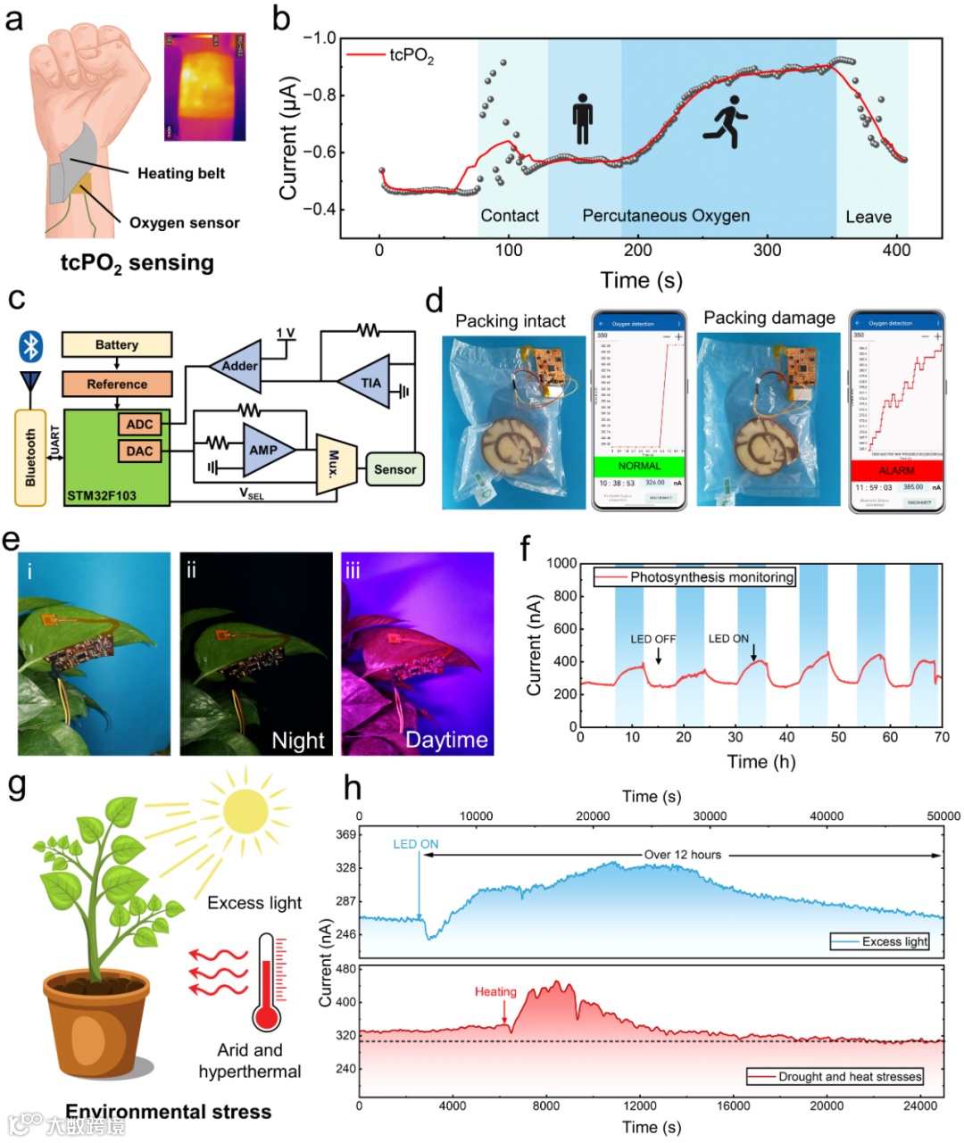 3、柔性设计支持器件的可穿戴经皮氧监测应用,同时结合蓝牙与云技术实现无线远程监控。应用于智能食品包装和植物生理监测,拓展了传统氧气传感器的使用场景。