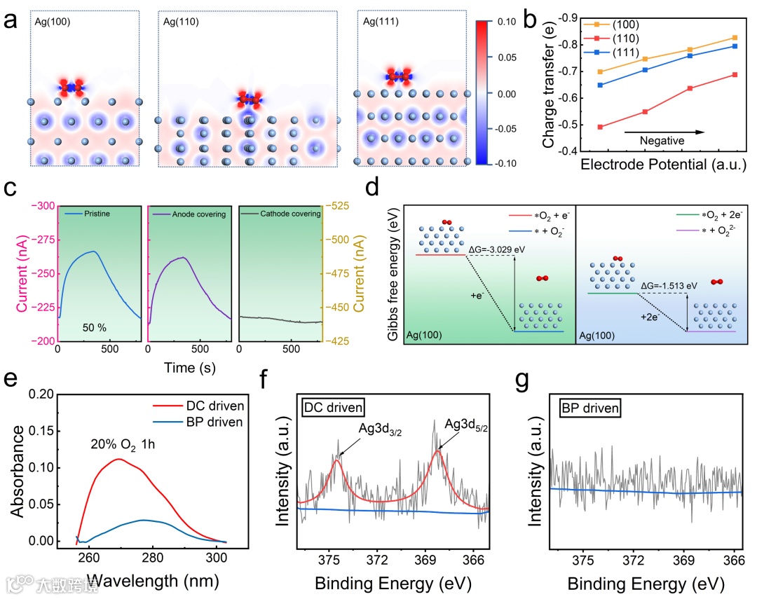 基于前期假设,本研究通过理论计算与实验验证揭示了传感器的工作机制。DFT计算表明:在负脉冲驱动下,氧气分子会从银电极获得电子形成带负电的超氧阴离子(图5a),且负电位增强会促进电荷转移(图5b)。电极屏蔽实验进一步证实:当阴极被Ecoflex弹性体覆盖时,传感器对50% O₂完全无响应(图5c),确证氧分子仅在阴极发生还原反应。