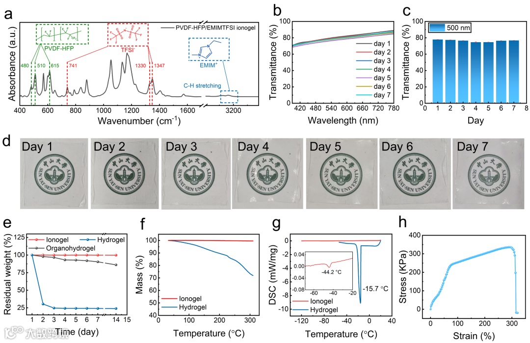 本研究采用环境稳定的离子凝胶作为气敏材料,以聚偏氟乙烯-六氟丙烯共聚物(PVDF-HFP)为聚合物骨架,1-乙基-3-甲基咪唑双三氟甲磺酰亚胺盐(EMIMTFSI)为离子液体介质。PVDF-HFP链中的C-F键通过强电负性与离子液体阳离子产生强烈离子-偶极相互作用,形成致密聚合物网络。傅里叶变换红外光谱分析显示,480、510和615 cm⁻¹处的振动峰对应PVDF-HFP的α和β相,741、1330和1347 cm⁻¹处的特征峰证实TFSI⁻阴离子的存在,3050-3250 cm⁻¹处的C-H伸缩振动则验证了EMIM⁺阳离子的成功引入(图2a)。该材料在室温下连续放置七天依旧维持较高的透光率,表明了其良好的环境稳定性(图2c-d)。对比实验表明:聚丙烯酰胺-卡拉胶水凝胶3天内失重75%,而离子凝胶14天内重量几乎无变化(图2e)。热重分析显示其热稳定性达300℃以上(图2f),差示扫描量热测定其凝固点低至-44.2℃(图2g)。以上实验表明,相比其水凝胶或者有机水凝胶,离子凝胶具有更优异的环境耐受性。力学测试证实该材料具有313%的断裂伸长率和336 kPa的抗拉强度(图2h),充分满足可穿戴设备应用需求。