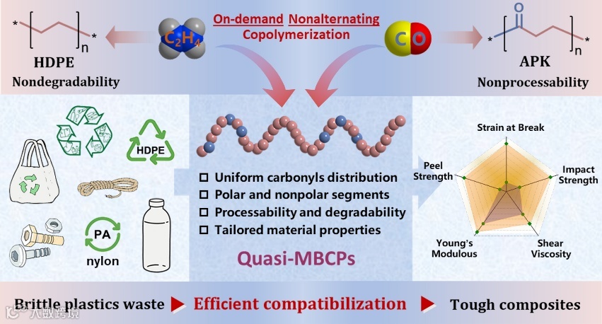 每年,全球产生超过3亿吨塑料垃圾,其中聚乙烯(PE)和尼龙(PA)因化学性质差异难以混合回收,最终沦为填埋场或海洋污染物。如何将这两种“水火不容”的塑料转化为高性能材料?大连理工大学刘野团队的最新研究,首次实现了羰基在聚酮链中的宏观均匀分布,让材料性能实现"按需订制",成功实现PE与尼龙的高效兼容,为混合塑料回收开辟新路径。
