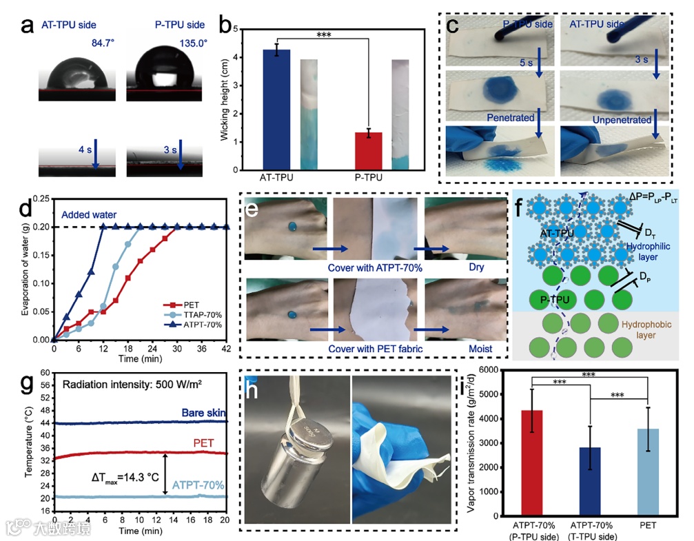 材料的创新性之一在于结合了仿生汗液管理:AT-TPU层经亲水改性后接触角为84.7°(3秒内浸润),P-TPU层形成疏水表面(接触角135°)。当疏水侧接触皮肤时,3-6μm大孔径与0.1-2μm小孔径形成的梯度结构以及梯度润湿性产生毛细压差,驱动液体在2秒内穿透膜层(图4c左)。蒸发速率达1.5g/h,是PET纺织品的3.2倍(图4d)。