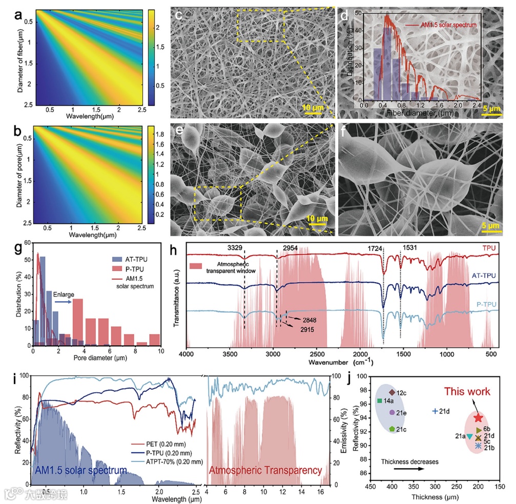 ATPT-70%的光学性能显著超越传统材料:双层膜在300-2500nm波段平均反射率达94%,较商用聚酯纺织品(PET, 73.1%)提升28.8%。其反射谱拓宽源于多级散射机制——仿真模拟显示(图2a-b),0.1-2.5μm纤维与0.1-6μm孔洞协同覆盖了太阳光谱峰值区域。热管理性能方面,P-TPU层相变焓值达111.8J/g,100次冷热循环后仍保持96.3%的焓值(图3b-c),28℃相变温度精准匹配人体舒适区。