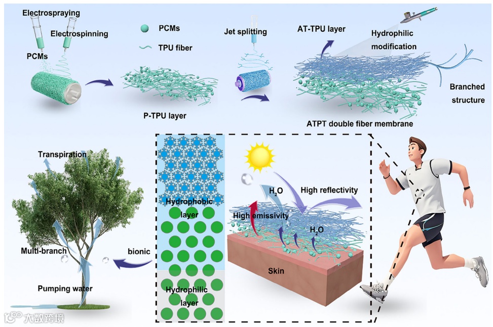 该研究通过三个关键机制实现热管理技术:射流分裂技术实现0.1-2.5μm多分散纤维制备,克服厚度-反射率制约;植物蒸腾启发的梯度结构驱动高效蒸发(392.5W/m²);纺丝-喷涂联用提升PCM负载瓶颈。ATPT-70%膜为高温高湿环境下的可穿戴设备、建筑节能及特种防护提供变革性解决方案,其“反射-储热-蒸发”协同机制为智能热管理材料设计树立新范式。