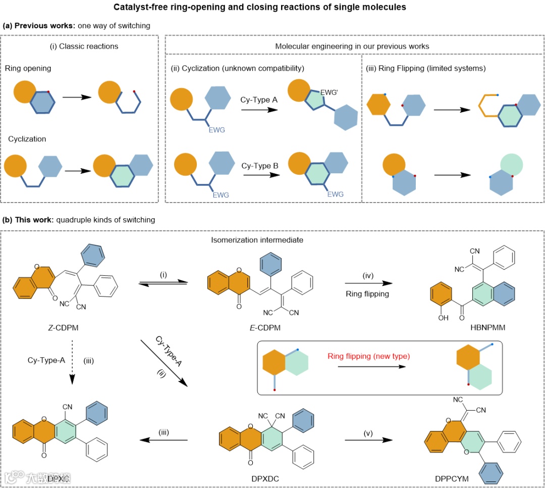 图1 多重响应荧光分子的设计策略。(a)传统无催化剂的单分子体系中开环/闭环反应。EWG:吸电子基团,Cy:环化反应。(b)Z-CDPM在不同条件下的热反应与光反应示意图:(i) 在C₂D₂Cl₄中145℃下退火1天;(ii) 在二苯醚中200℃下退火2小时;(iii) 在硅胶中145℃下退火1天;(iv, v) 室温下在C₂D₂Cl₄中用365 nm紫外灯(0.12 mW/cm²)照射2小时。