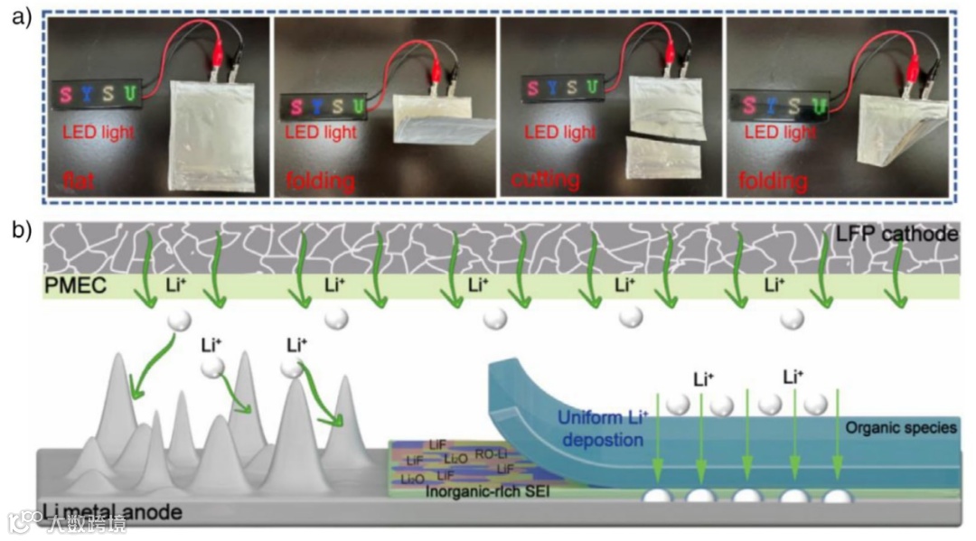 近日,中山大学材料科学与工程学院张鹏课题组从橡胶轮胎的耐久性和多级结构中获得灵感,设计并制备了一种新型自适应固态弹性电解质(PMEC)。该电解质模仿轮胎“软橡胶基质+液体增塑剂+刚性增强网格”的复合结构,通过将深共晶电解质(DEE)均匀嵌入化学交联的聚合物网络中,并引入聚乙烯(PE)多孔骨架增强,成功实现了高离子电导率(30°C下2.37 mS cm⁻¹)、高锂离子迁移数(0.64)、优异弹性(拉伸应变187%)和强界面粘附力(36.34 J m⁻²)的协同提升。基于PMEC组装的对称电池可稳定循环超过2000小时,与LiFePO₄正极匹配的全电池在0.5C下循环800次后容量保持率超过88%,并在切割、弯曲等机械滥用下仍保持正常工作。