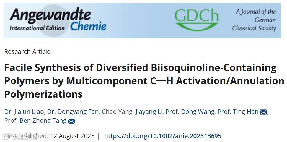 相关工作以Facile Synthesis of Diversified Biisoquinoline-Containing Polymers by Multicomponent C‒H Activation/Annulation Polymerizations为题,发表在Angewandte Chemie International Edition。文章第一作者为深圳大学硕士研究生廖嘉俊同学和专职副研究员范冬阳博士,香港中文大学(深圳)唐本忠教授和深圳大学韩婷副教授为本文共同通讯作者。