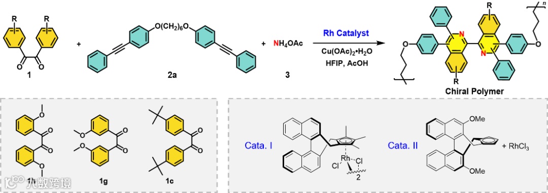 具有独特光物理性质、优异配位能力和潜在轴手性的联异喹啉骨架在不对称催化、材料科学、药物化学等领域受到广泛关注。然而,受到合成限制,含有联异喹啉骨架的聚合物(Biisoquinoline-Containing Polymers, BCPs)却鲜有报道,通过不对称催化聚合来制备手性BCPs更是尚未实现。近日,香港中文大学(深圳)唐本忠教授、深圳大学韩婷团队开发了一种新颖的多组分级联C-H活化/环化聚合策略(图1)。该工作所报道的聚合策略能够通过连续的C-H活化和N-环化过程,将简单易得的苯偶酰衍生物、内炔单体和醋酸铵便捷转化为结构多样的BCPs,这是其他聚合方法难以实现的。这种铑催化下的C-H活化/环化聚合反应在空气条件下即可高效进行,能够以高达99.1%的产率制得系列高分子量的BCPs(图2、图3)。得益于其多取代的结构特点,所得产物具有良好的溶解性、优异的成膜能力以及易于调节的发光特性,其中含有光敏基团的BCP发光薄膜可用于制备高分辨率的荧光光刻图案(图4)。此外,考虑到主链中多取代联异喹啉基团的潜在轴手性特点,作者进一步采用不同的手性环戊二烯基铑催化剂,开发了不对称催化的C-H活化/环化聚合反应,成功制备出系列具有光学活性的BCPs和BCP-金属配合物(图5)。