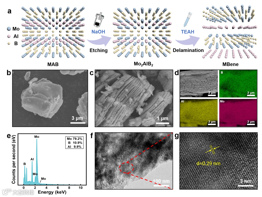MBene是通过在碱性水热条件下对MoAlB(MAB)进行选择性铝层脱插层的拓扑化学转化制得。引入四乙基氢氧化铵(TEAOH)作为插层剂后,层间距扩大35%(从0.23 μm增至0.31 μm),从而促进其剥离形成单层纳米片。如图1a所示,通过氢氧化钠(NaOH)序列蚀刻与TEAOH插层处理,将致密MAB(图1b)转化为保留晶体序列的褶皱式结构(图1c)。通过精心优化的两步蚀刻工艺实现了该褶皱形态:先进行NaOH初蚀刻(150 °C,24 h),再进行TEAOH插层,证实了TEA阳离子插层的关键作用。蚀刻后上清液与沉淀物中均存在褶皱状MBene,证实了反应均匀性。能谱分析(EDS)(图1d)证实元素演化过程:铝含量从19.6 at%(MAB)降至9.9 at%(MBene)(图1e),验证了铝的选择性去除。通过高分辨率透射电子显微镜(HRTEM)(图1f-g)揭示了Mo₂AlB₂的(020)晶面(d=0.29 nm)与剥离出的纳米片之间存在晶体学一致性,证实了剥离过程中存在外延生长现象。