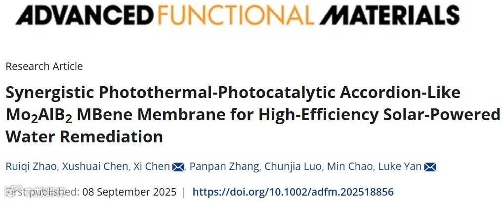 该工作以“Synergistic Photothermal-Photocatalytic Accordion-like Mo₂AlB₂ MBene Membrane for High-Efficiency Solar-Powered Water Remediation”为题发表在《Advanced Functional Materials》上。长安大学2023级硕士研究生赵瑞琪为第一作者,长安大学颜录科教授、陈曦博士为共同通讯作者。该研究工作得到陕西省创新能力支持计划、陕西省重点研发计划、中央高校基本科研业务费专项资金等的支持。
