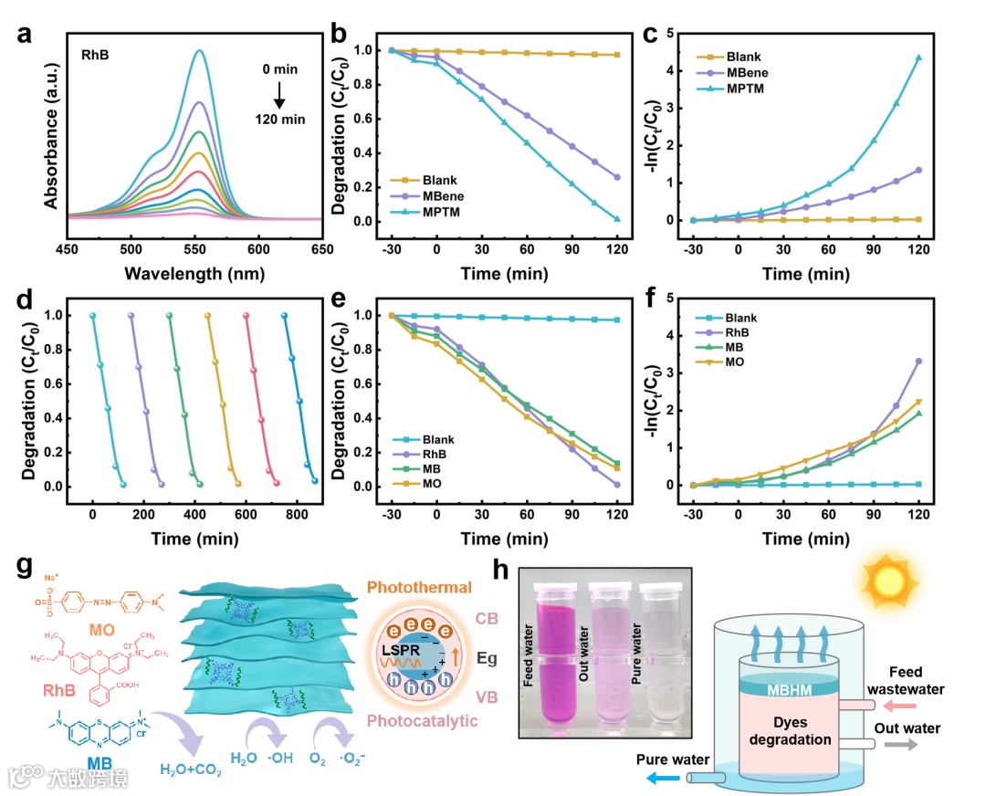 图4 光催化-光热协同效应:a) 紫外光谱显示时间分辨的RhB降解过程;b) 120分钟内MBene矿化效率达74%,MPTM达98.7%;c) 光热加速分解;d) 催化剂稳定性:经6次循环后活性保持96.5%;e-f) 对阳离子/阴离子染料的广谱降解效能;g) 机理示意图:染料经∙O₂⁻/∙OH级联反应实现光降解;h) 集成太阳能净化系统:同步实现纯水光热蒸馏与废水光催化净化。