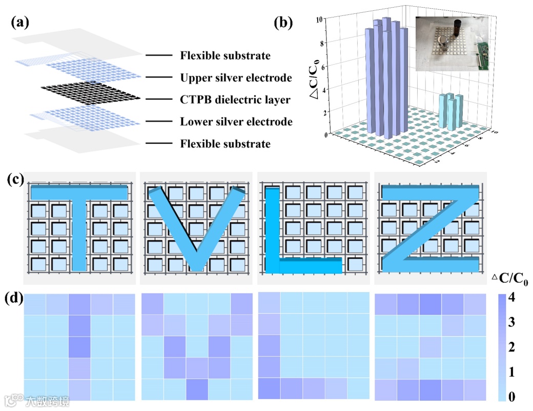 图8. CTPB传感器在柔性压力传感器阵列中的演示:a)柔性压力传感器阵列结构示意图。b)放置不同重量物体时传感器阵列的压力分布和电容变化图;c、d)放置不同的字母模具和传感器阵列上传感单元的相应电容变化。