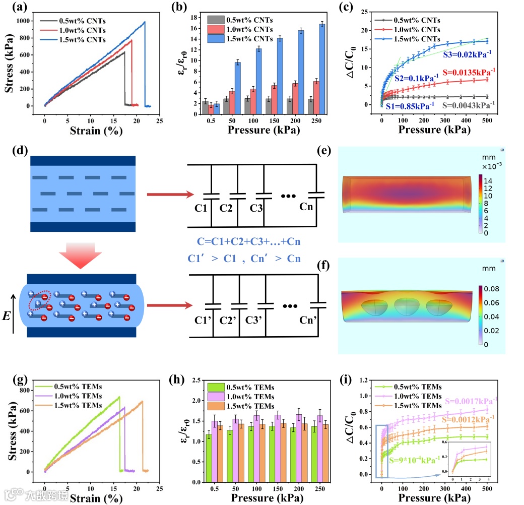 图3. CNTs/PDMS和TEMs/PDMS的性能研究:a–c)CNTs含量对复合材料力学性能、相对介电常数和电容变化率的影响;d)CNTs在压力下形成微电容器的工作原理;e、f)COMSOL模拟压力下有无TEMs的PDMS层变形示意图;g–i)TEMs含量对复合材料力学性能、相对介电常数和电容变化率的影响。