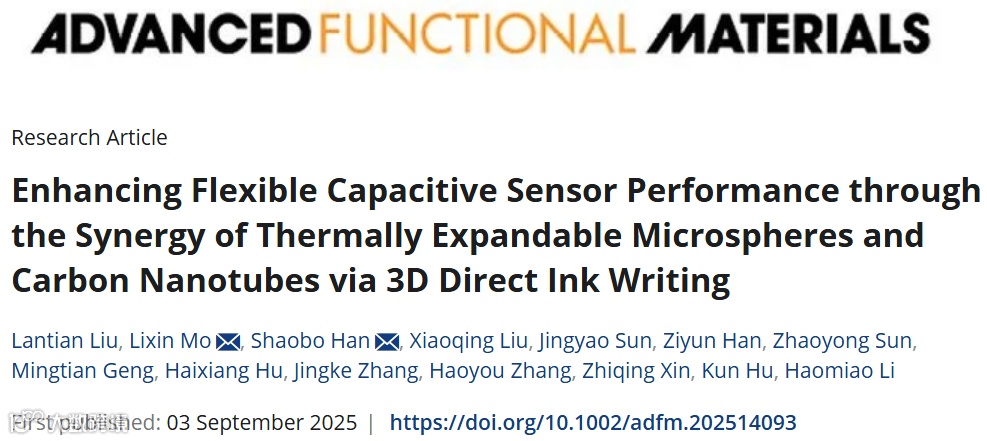 近期,由北京印刷学院莫黎昕与五邑大学韩少波领导的研究团队,成功开发出一种新型电容式柔性压力传感器,并在AFM期刊上成功发表,文章的第一作者是北京印刷学院硕士研究生刘蓝天。文中提到的传感器以碳纳米管(CNTs)、热膨胀微球(TEMs)和聚二甲基硅氧烷(PDMS)复合介电层为基础,通过直写(DIW)技术制备而成。CNTs与TEMs的协同效应调控了传感器的机械与介电响应,使其灵敏度相较仅含CNT的体系提高了两个数量级。表面沟槽状微结构可迅速稳定地排出空气,从而增强受压时的介电常数变化与灵敏度。所开发的传感器在0–500 kPa的超宽压力范围内表现出最高达3.09 kPa-1的灵敏度,检测限低至16.7 Pa,同时还具备0.3%的压力分辨率、超过40,000次循环的稳定性以及快速响应特性。这些性能表明该传感器在柔性压力传感领域具有广泛应用潜力。值得一提的是,集成后的电容传感器阵列能够实现压力刺激的空间检测,进一步拓展了其应用场景与实用价值。
