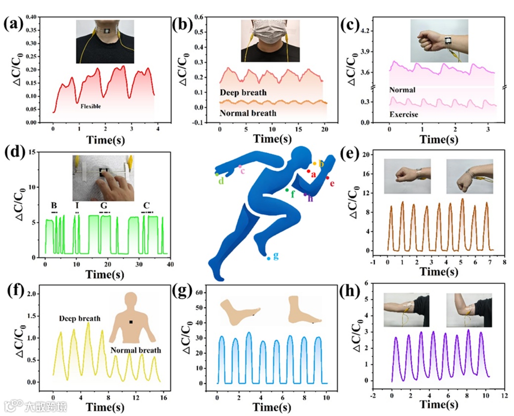 图7. CTPB柔性压力传感器在不同人类活动和物理信号监测中的应用:a)喉咙发声;b)呼吸;c)手腕脉搏;d)手指按压;e)手腕弯曲;f)呼吸时胸部收缩和扩张;g)步态行走;h)手臂弯曲和伸展。