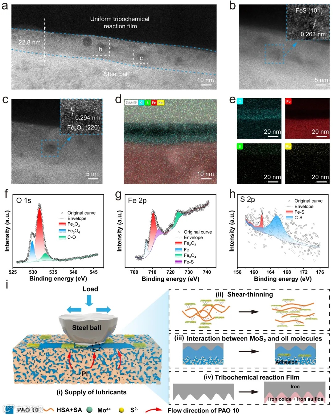图4 浸渍改性PAO 10凝胶PPI的润滑机制。a)钢球磨痕截面的TEM图像;b,c)磨痕区域不同位置的HR-TEM图像(插图为放大区域);d)钢球摩擦膜的HAADF图像及e)Fe、O、S、Mo元素分布;摩擦膜的高分辨率XPS谱:f)O1s,g)Fe2p,h)S2p;i)PPI-gel-TAM的工作机理图示。