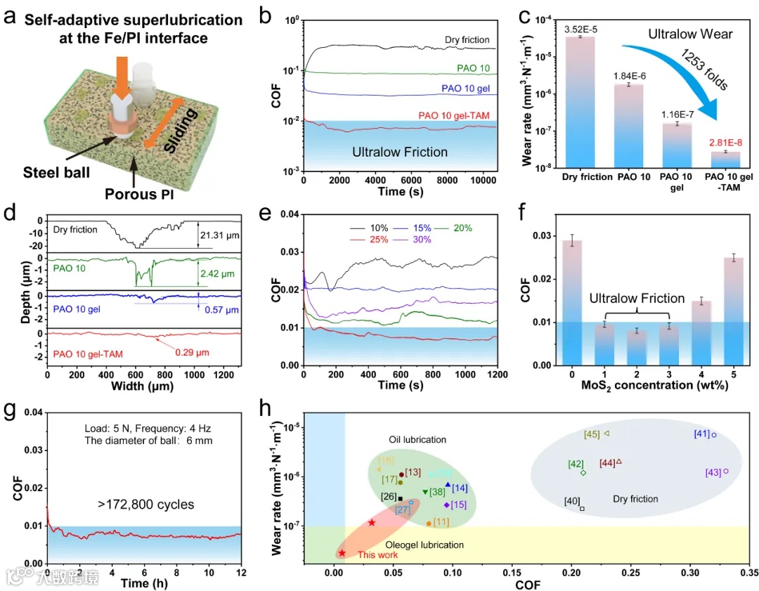 图3 浸渍不同润滑剂的PPI的摩擦学性能。a)摩擦学实验装置示意图;b)含不同润滑剂PPI的摩擦系数;c)磨损率对比;d)磨痕深度曲线;e)稠化剂浓度对摩擦系数的影响;f)MoS2浓度对摩擦系数的影响;g)浸渍PAO 10 gel-TAM的PPI的长期摩擦系数;h)本工作中PPI的摩擦系数和磨损率与之前工作的对比。
