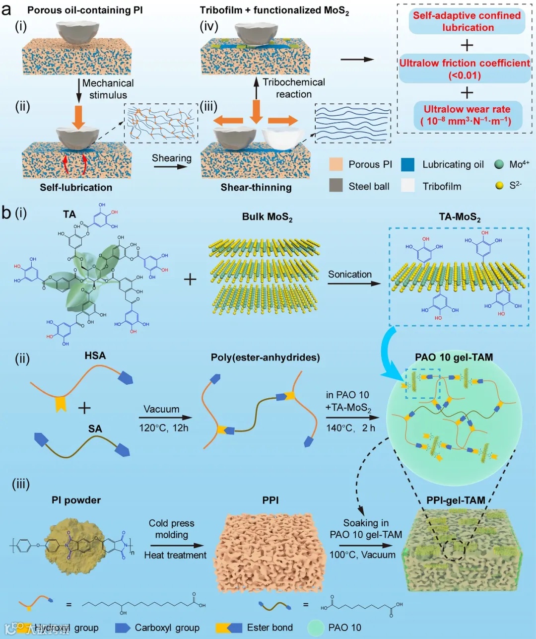 图1 超低摩擦磨损自润滑多孔聚酰亚胺(SL-PPI)的概念与制备工艺。a)SL-PPI设计示意图;b)制备流程:i)单宁酸改性MoS2纳米片(TA-MoS2),ii)改性PAO 10凝胶(PAO 10 gel-TAM),iii)凝胶浸渍多孔聚酰亚胺(PPI-gel-TAM)。