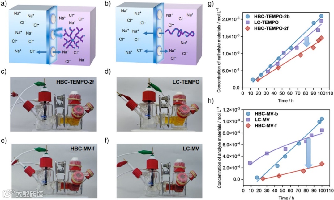 图2. a,b) 窄分布HBCs或线性共聚物的跨膜污染实验示意图。c–f) HBCs阴极电解液、线性聚合物阴极电解液、HBCs阳极电解液及线性聚合物阳极电解液在50小时的跨膜污染实验照片;g) 在25 °C下,相同浓度的HBCs及线性聚合物阴极电解液的跨膜污染程度;h) 在25 °C下,相同浓度的HBCs及线性聚合物阳极电解液的跨膜污染程度。