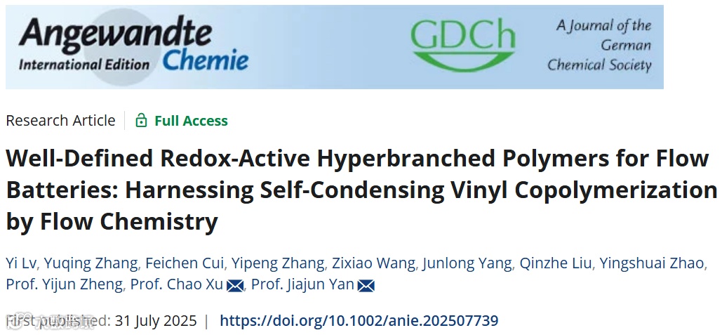 为了解决这一问题,上海科技大学严佳骏课题组与许超课题组合作首次利用流动化学装置制备了一种窄分布的高氧化还原活性超支化共聚物(HBCs)。相关论文以“Well-Defined Redox-Active Hyperbranched Polymers for Flow Batteries: Harnessing Self-Condensing Vinyl Copolymerization by Flow Chemistry”为题,于2025年7月31日发表在《Angew. Chem. Int. Ed.》上,第一作者为吕毅。