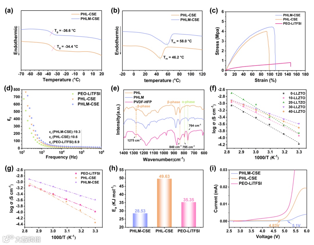 Figure 2. Structural features and electrochemical performance of the PHLM-CSE composite electrolyte membranes. (a) Differential scanning calorimetry (DSC) curves of PHL-CSE and PHLM-CSE electrolytes, highlighting their glass transition temperature (Tg) ; (b) DSC curves of PHL-CSE and PHLM-CSE in the higher-temperature region, illustrating thermal stability; (c) Stress-strain curves of PHL-CSE, PHLM-CSE, and PEO-LiTFSI electrolytes, revealing mechanical strength and flexibility; (d) Frequency-dependent dielectric constant (εr) of PEO-LiTFSI, PHL-CSE, and PHLM-CSE electrolytes; (e) FTIR spectra of PHL, PHLM and pristine PVDF-HFP membranes, demonstrating polymer phase characteristics and structural features; (f) Arrhenius plots of ionic conductivity (σ) versus temperature for PHLM-CSE electrolytes with varying LLZO contents; (g) Comparative ionic conductivity-temperature profiles of PEO-LiTFSI, PHL-CSE, and PHLM-CSE electrolytes; (h) Bar graph comparing the lithium-ion migration activation energy (Ea) across different electrolytes; (i) Linear sweep voltammetry (LSV) curves evaluating the electrochemical stability window of the investigated membranes.
