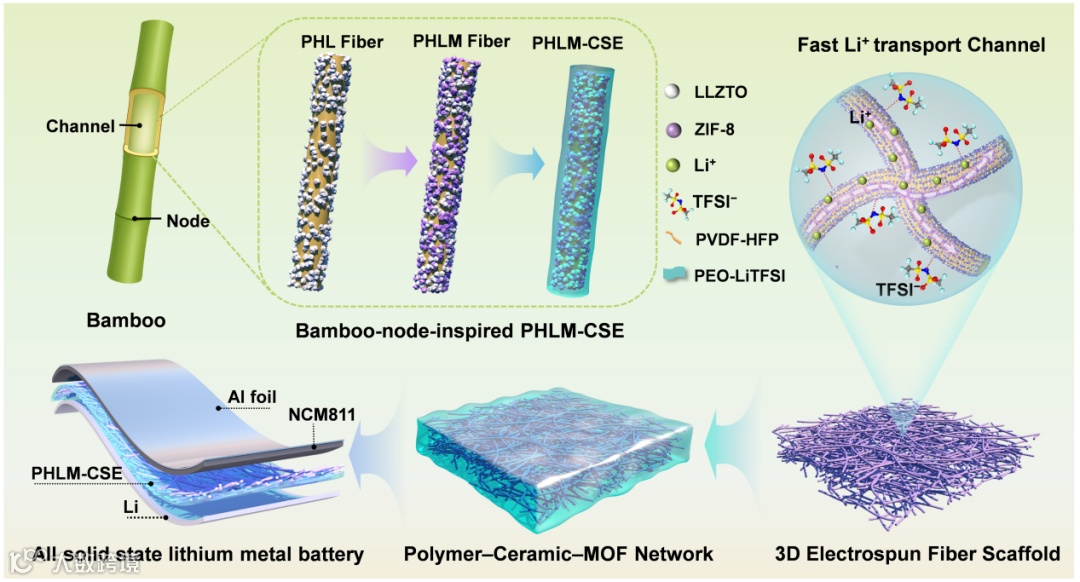 机理示意图:仿生竹节结构复合固态电解质(PHLM-CSE)及其分级离子传输通道的示意图。