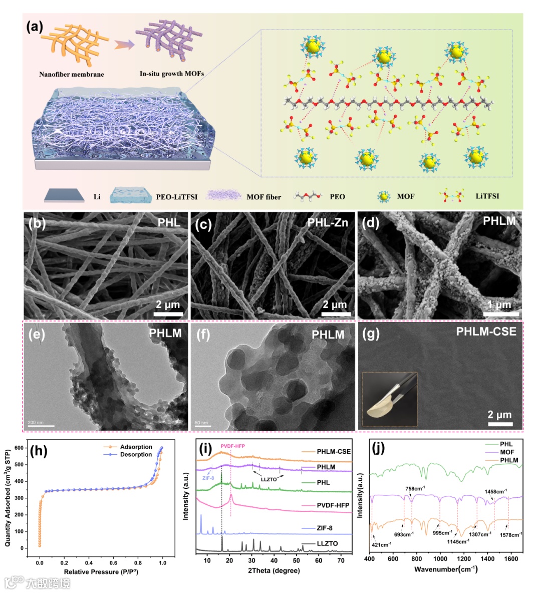 Figure 1. Structural design and morphological analysis of the PHLM-CSE composite solid-state electrolyte. (a) Schematic illustration of the three-dimensional architecture of the PHLM-CSE and the proposed mechanism by which MOF facilitates Li+ transport; (b) SEM image of the PVDF-HFP/LLZTO nanofiber membrane (PHL), scale bar : 2 μm; (c) SEM image of the PHL-Zn nanofiber membrane after Zn2+ ion adsorption, scale bar: 2 μm; (d) SEM image of the PHLM nanofiber membrane following in situ MOF growth, scale bar: 1 μm; (e, f) TEM images of the PHLM nanofiber membrane highlighting internal structure; (g) SEM image of the surface morphology of the PHLM-CSE electrolyte, scale bar: 2 μm. Inset: photograph image of the as-prepared membrane; (h) Nitrogen adsorption-desorption isotherm of the as-prepared ZIF-8 measured at 77.3 K; (i) XRD patterns of the PHLM-CSE electrolyte, PHLM and PHL membranes, pristine PVDF-HFP, ZIF-8, and LLZTO. Key diffraction peaks for PVDF-HFP, LLZTO, and ZIF-8 are indicated by dotted lines and arrows for clarity; (j) Fourier transform infrared (FTIR) spectra of the PHL, ZIF-8, and PHLM nanofiber membranes.