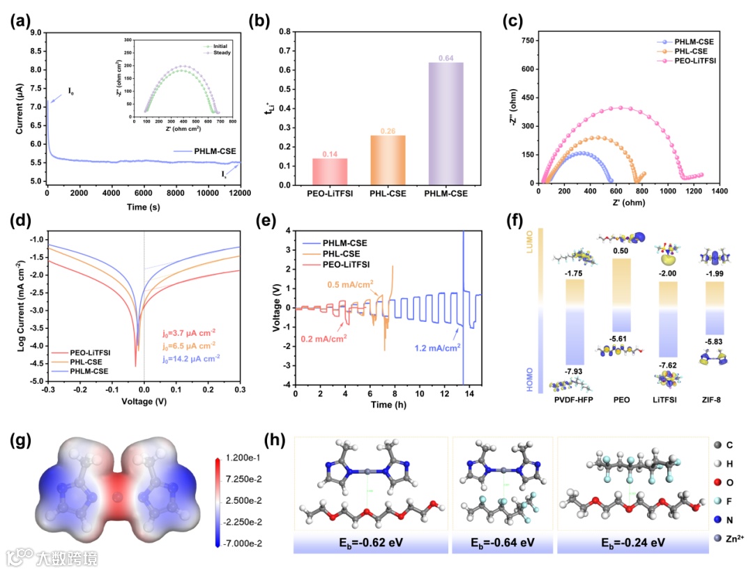 Figure 3. Electrochemical properties and interfacial stability analysis of the PHLM-CSE composite solid-state electrolyte. (a) Galvanostatic charge-discharge profiles of the PHLM-CSE-based cell, with the inset displaying the corresponding electrochemical impedance spectroscopy (EIS) data; (b) Comparison of lithium-ion transference numbers (tLi+) for PEO-LiTFSI, PHL-CSE, and PHLM-CSE electrolytes; (c) Electrochemical impedance spectra (EIS) of symmetric Li|PEO-LiTFSI|Li, Li|PHL-CSE|Li, and Li|PHLM-CSE|Li cells, reflecting interfacial resistance; (d) Linear sweep voltammetry (LSV) curves used to evaluate the electrochemical stability windows of different electrolytes; (e) Critical current density (CCD) measurements of Li|Li symmetric cells with PEO-LiTFSI, PHL-CSE, and PHLM-CSE electrolytes; (f) Molecular structures and corresponding HOMO-LUMO energy level diagrams of PVDF-HFP, PEO, LiTFSI, and ZIF-8; (g) Electrostatic potential distribution map of ZIF-8, indicating charge localization characteristics; (h) Binding energies (Eb) and optimized configurations of ZIF-8 interacting with PEO, PVDF-HFP, and their binary complex.