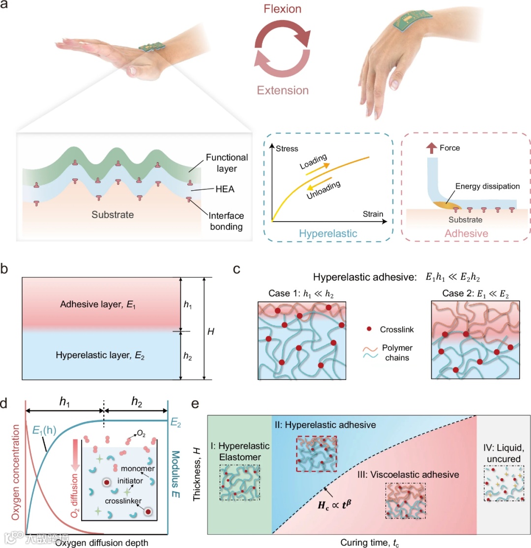 超弹性和粘附性的结合使HEA在新兴技术中具有吸引力。例如,HEA可以用作可变形基板(如手腕上的人体皮肤)上功能层(如电子设备)的可靠平台(图1a)。在手腕的屈伸过程中,HEA使功能层牢固地锚定在皮肤上,同时保持稳定的性能。从结构上讲,HEA包含一个异质结构,由粘合层和超弹性层组成(图1b)。粘合剂层与长链交联松散,或与大量悬挂链交联不良。通过静力学的力平衡分析,认为梯度表面层的响应可以等同于一个均匀层(图1c),该均匀层的厚度可以通过控制氧气阻聚自由基聚合过程中的氧气扩散的深度来确定(图1d),通过深入探究氧气阻聚动力学中的聚合时间以及HEA总厚度的幂律关系得到聚合相图,分析聚合相图非均相聚合物网络可以是HEA,具有适当定制的粘合剂层和超弹性层的机械和几何性能(图1e)。