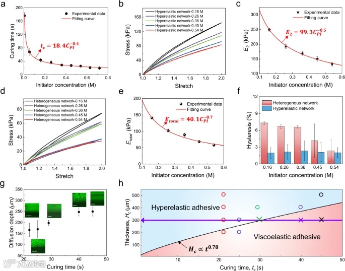 (图2e)。当引发剂浓度为0.54 M时,超弹性均匀P(BA-co-AA)网络和非均匀P(BA-co-AA。E2和Etotal均被确定为在5%应变范围内通过线性拟合相应载荷曲线数据获得的斜率。