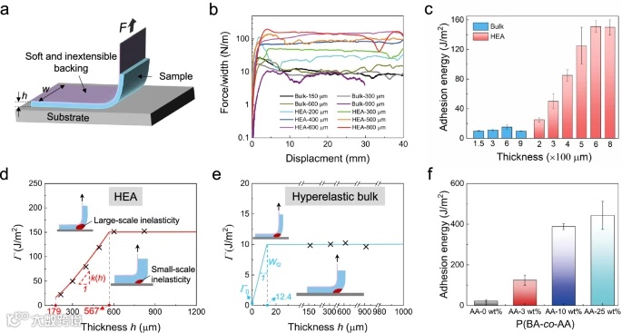 研究人员将粘合剂表面粘附到丙烯酸酯基材上,另一个表面粘附到柔软且不可拉伸的背衬上(图3a)。剥离力-位移曲线如图3b所示。还绘制了超弹性块体的剥离力-位移曲线。图3c比较了HEA和超弹性块体的粘附能。当样品的厚度小于断裂粘结长度时,会出现大规模的非弹性,断裂过程区会在整个厚度范围内扩展。在这种情况下,由于有效断裂过程区增加,粘附能随着厚度的增加而增加。当样品的厚度大于断裂粘结长度时,存在小规模的非弹性,断裂过程区小于厚度。在这种情况下,由于即使厚度增加,有效断裂过程区也是恒定的,因此粘附能趋于平稳。研究了当厚度低于断裂粘合长度时HEA与均匀超弹性本体聚合物的粘合能-厚度关系(图3d-e)。通过调整化学成分,如AA的含量,可以显著提高HEA的粘附能。