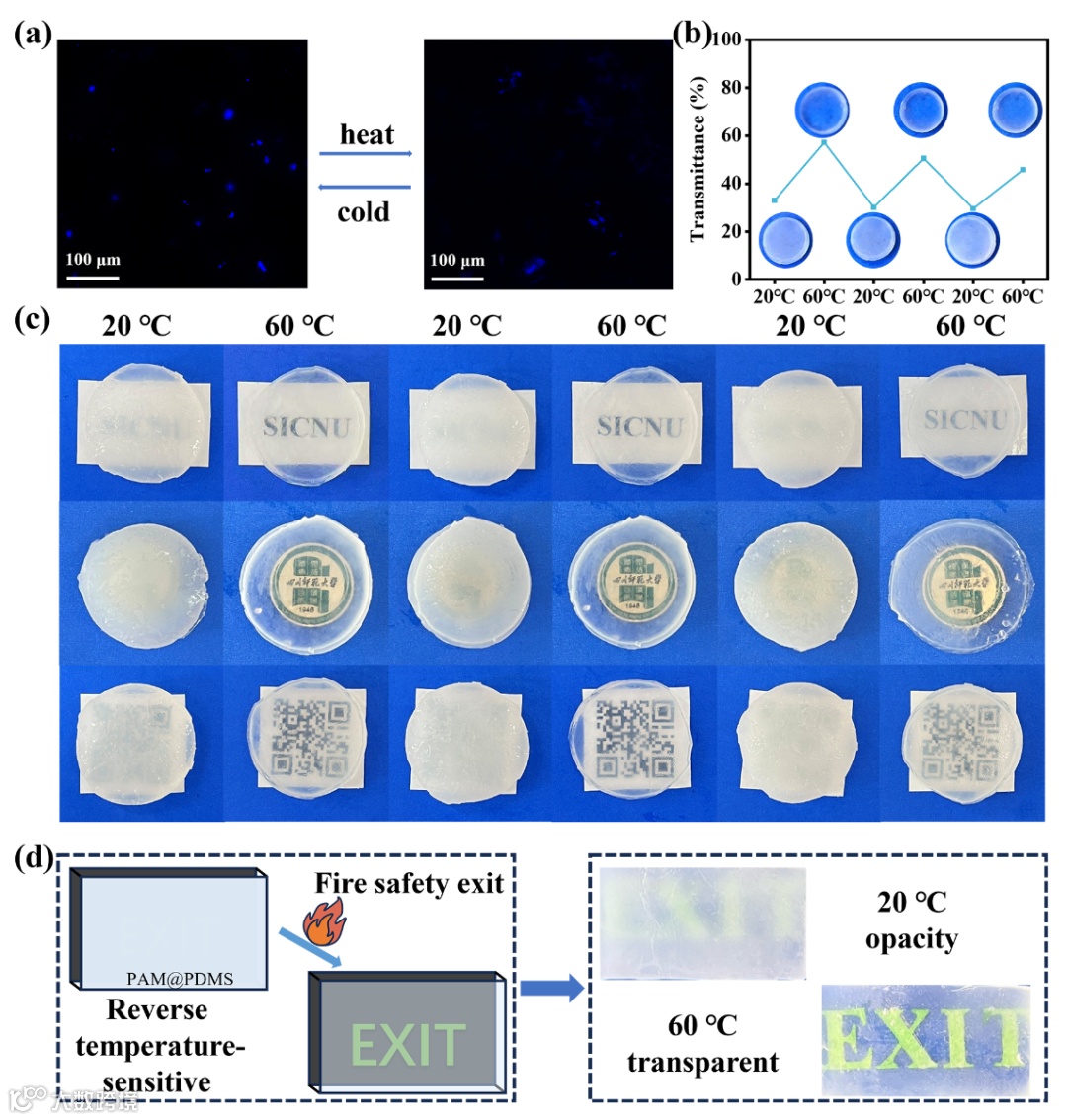 逆温敏水凝胶在室温下呈低透明度,而加热后则转变为透明状态,这类材料在信息加密、热显示和应急信号等方面展现出独特优势。然而,如何将这种光学响应性与优异的力学性能、保水性以及界面黏附性有机结合,仍然是一项挑战。
