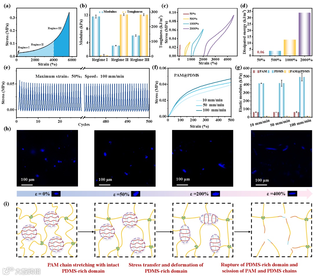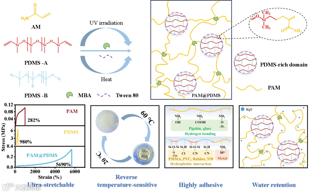 近期,四川师范大学赵丽娟教授、王义副教授团队在Materials Horizons上发表了题为“High-performance reverse thermoresponsive hydrogel enabled by one-pot PDMS-enriched domain crosslinking”的研究论文。本文报道了一种兼具机械韧性与逆温敏响应性能的水凝胶(PAM@PDMS hydrogel),该材料通过一种简单的乳液辅助一锅法聚合策略制备而成(见Scheme 1)。在该体系中,疏水性的聚二甲基硅氧烷(PDMS)预聚物在吐温80(Tween 80)乳化剂的作用下,分散形成稳定的类微凝胶结构域,嵌于亲水性的聚丙烯酰胺(PAM)基体中。经紫外光(250 W,5 min)引发聚合后,含Si–H键的PDMS链与结构域内部的乙烯基封端PDMS发生反应,形成交联的富PDMS结构域。同时,结构域–水界面处的乙烯基PDMS与AM发生共聚,进一步构建了一个由结构域交联的三维网络结构,将疏水与亲水部分协同地共价整合。该多层次结构赋予水凝胶应变下PAM与PDMS链的逐级展开以及PDMS结构域的渐进变形能力,从而实现优异的拉伸性能(断裂应变达5680%)、韧性(5.8 MJ/m³)及耐疲劳性能。在室温下,PDMS结构域与PAM基体之间的折射率差异增强了界面光散射,表现为不透明外观;而升温过程中,由熵驱动的结构域重组降低了散射效应,使材料迅速恢复透明状态,并具备可逆的热响应行为。这一特性使其可应用于热信息解密、动态光学切换和紧急可视化信号等场景。此外,PDMS结构域还显著提升了水凝胶的保水性,并赋予其对多种基底的强黏附能力,包括金属、塑料、橡胶、玻璃、猪皮、水凝胶、弹性体和纤维等。通过引入NaCl,水凝胶还具备了应变感知功能,可实现变形过程的实时监测。因此,本研究构建的PAM@PDMS水凝胶独特地将光响应性、机械强度、界面黏附性、保水能力与传感功能集成于单一材料平台中,展现出卓越的综合性能。该成果不仅为高性能温敏水凝胶的结构设计与性能调控提供了新思路,也为其在防伪标识、信息显示、柔性电子与智能调光等前沿应用领域的推广奠定了坚实基础,展示出广阔的应用前景。