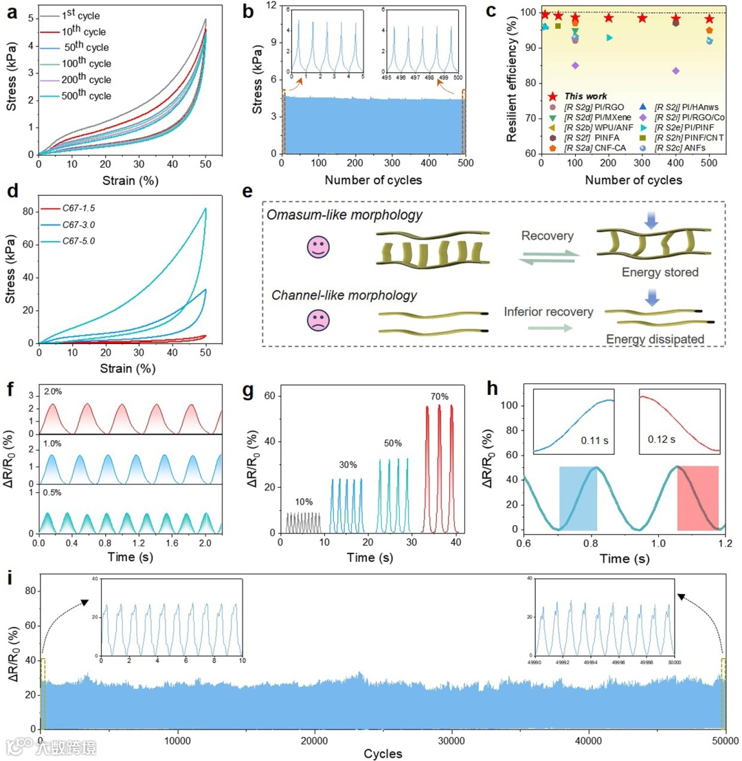 由于冷冻过程引发多向热传递,使得冰晶在模具表面均匀成核,而非仅集中在模具底部。这种现象导致冰晶从边缘向中心呈放射状生长,使得复合气凝胶形成了独特核心辐射结构,在压缩过程中表现出明显的负泊松比行为,赋予气凝胶良好的结构稳定性。气凝胶在承受80%压缩应变时仍能保持结构完整,并展现出优异的应变恢复能力(>98%),且能量耗散极小(图3)。C67-1.5气凝胶展现出优异的抗压缩性(500次循环压缩后保持98.2%的弹性效率)和抗应变传感性能,经过多次压缩循环后仍无明显的信号衰减。凭借卓越的机械韧性和宽泛的压缩范围,气凝胶在传感领域显示出良好的应用前景(图4)。