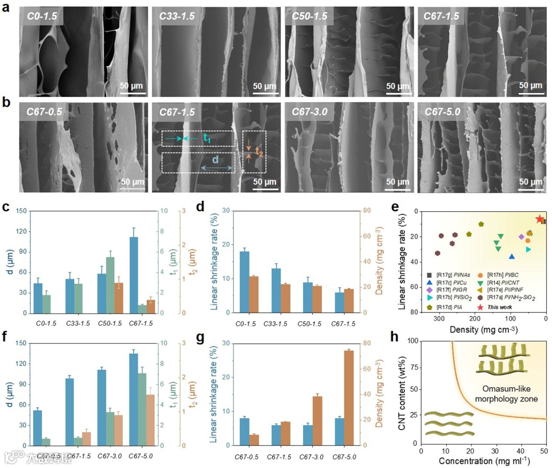 牛肚由数百层紧密排列的薄片构成,表面覆盖微米级乳突结构,其独特的多级通道网络能通过增大表面积和增加迂曲度来提升营养吸收效率。模仿这种结构有望促进电磁波的多重反射与散射,延长传播路径并增强吸收损耗。通过精确调控前驱体粘度和CNT含量,控制分散液体系的热力学,本研究制备了一系列具有三轴分级结构(宏观核心辐射模式、微观牛肚状褶皱及纳米级CNT桥)的聚酰亚胺/CNT气凝胶,成功模拟出类似牛肚的形貌(图1)。通过SEM进一步揭示了此类气凝胶毛肚状结构的衍生条件及机理,证实了毛肚状结构的存在降低了气凝胶的收缩率,更有利于结构的稳定(图2)。