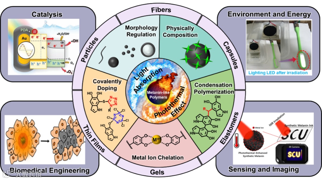 四川大学高分子科学与工程学院李乙文教授团队长期致力于人造黑色素材料的结构设计与关键性能调控。近日,该团队以封面形式在Accounts of Chemical Research发表论文,系统阐述了黑色素材料的光吸收与光热性能的调控策略。针对这一瓶颈问题,团队在前期工作中证实了黑色素材料的光热转换主要依赖于非辐射衰变过程,吸收的光可在1纳秒内转化为热能,而几乎不产生荧光和磷光。因此,调节黑色素材料的光吸收才是调控其光热能力的有效方法。基于此,研究团队系统提出了五类材料化学调控策略:包括形态调控策略、杂化集成策略、金属离子螯合策略、共价掺杂策略以及缩合聚合策略(图2-3)。这些策略可以有效调节材料中的共轭分子长度、能带隙和电荷转移路径,从而提升黑色素从紫光区到近红外光区的吸收能力。