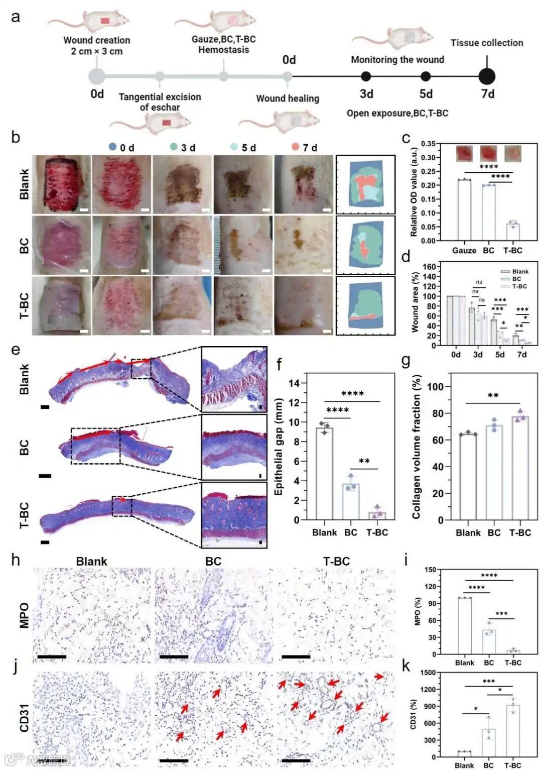 在模拟深Ⅱ度烧伤削痂创面的大鼠模型中,T-BC敷料展现出显著的促愈合效果。治疗组在第5天的创面闭合率明显高于未处理组,表明该材料可有效加速创面愈合进程(图3)。进一步的转录组学分析显示,T-BC能够调控多条与血管新生、炎症消退和细胞外基质重塑相关的信号通路,提示其在多阶段创面修复过程中发挥协同作用。这一分子层面的调控作用亦得到了细胞水平和组织学结果的佐证,验证了T-BC在创面微环境中长期稳定存在的基础上,兼具止血与组织再生的双重功能。