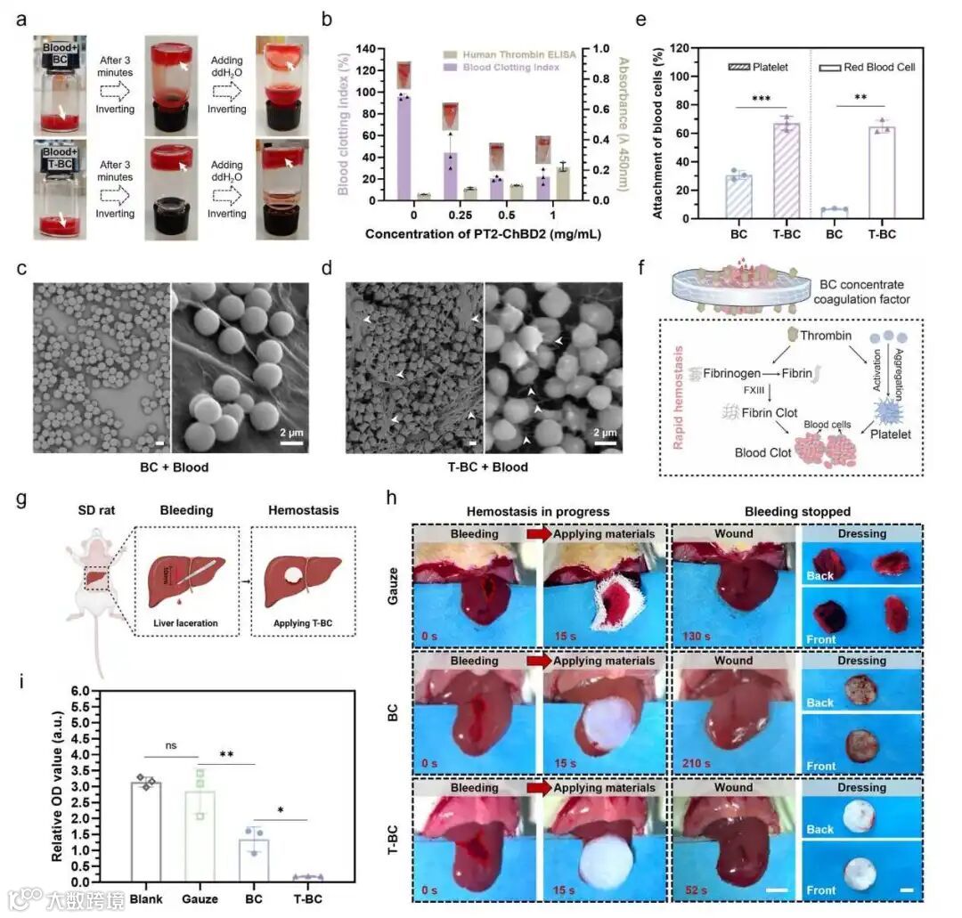 在初步实验中,研究团队首先筛选获得了能够与生物纤维素高效、稳定结合的纤维素结合结构域(CBD),并将其与人凝血酶原-2构建为融合蛋白进行表达。该融合蛋白经蛇毒酶Ecarin激活后成功转化为具有完整酶活性的CBD-凝血酶,并在体外实验中表现出显著的促凝血功能,能够快速诱导血液凝固。进一步通过大鼠肝脏切口模型验证了该策略的止血效果:CBD-凝血酶与BC基质的稳定结合将BC转化为具有生物活性的功能性止血敷料,可在1分钟内实现快速止血(图2),表现出优越的即时止血能力。此外,研究系统开展了T-BC敷料的细胞毒性、溶血活性与组织相容性评价,相关结果表明该材料具有良好的生物安全性,支持其在临床烧伤创面修复中的应用。