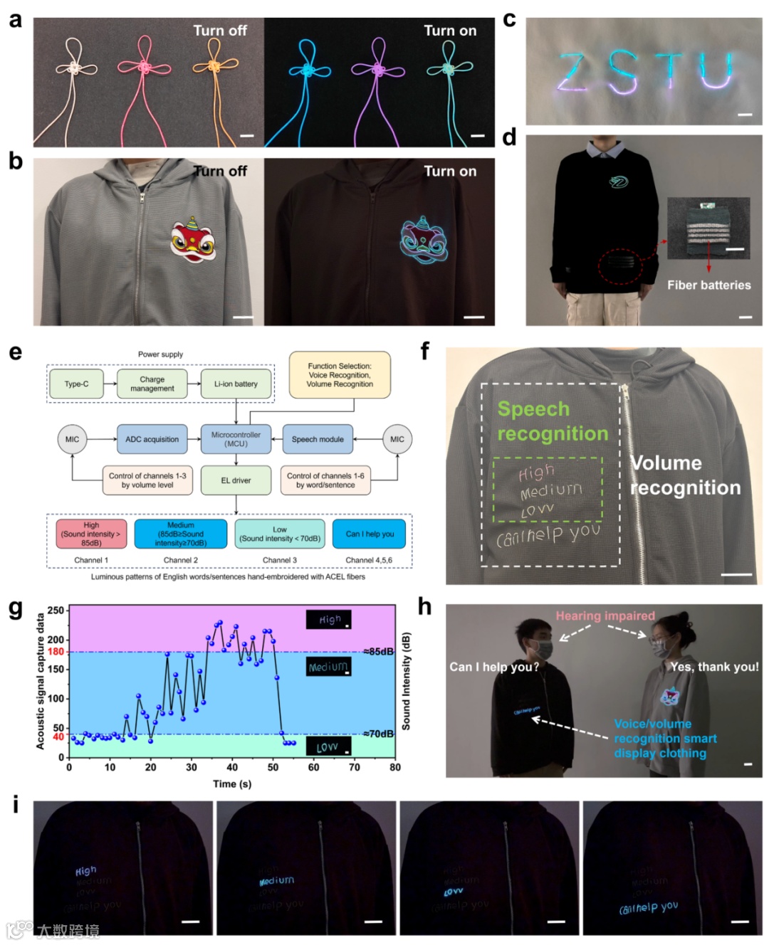 Fig. 5 Applications of ACEL fibers in intelligent textiles and interactive systems. a Auspicious knots are woven using ACEL fibers. Scale bar, 1 cm. b Hand-embroidered outline of the “Lion Dance” pattern, incorporating traditional cultural elements, using ACEL fibers. Scale bar, 5 cm. c Hand-embroidered monogram with color-blocking effects created using ACEL fibers. Scale bar, 1 cm. d Electronic garments incorporating ACEL fiber weaving patterns and embedded fiber batteries. Scale bar, 5 cm. e Block diagram of a sound sensor integrated with an ACEL device for voice recognition and volume detection. f Schematic of the external functional division of an intelligent e-garment with a visual display system for sound sensing. Scale bar, 5 cm. g Hand-embroidered word patterns using ACEL fibers, which alternate illumination based on changes in sound intensity. Scale bar, 1 cm. h Schematic diagram of barrier-free communication for the hearing impaired enabled by a smart electronic garment with a sound-sensing visual display system. Scale bar, 5 cm. i Precise word/sentence illumination controlled by voice recognition in a smart electronic garment equipped with a sound-sensing visual display system. Scale bar, 5 cm.